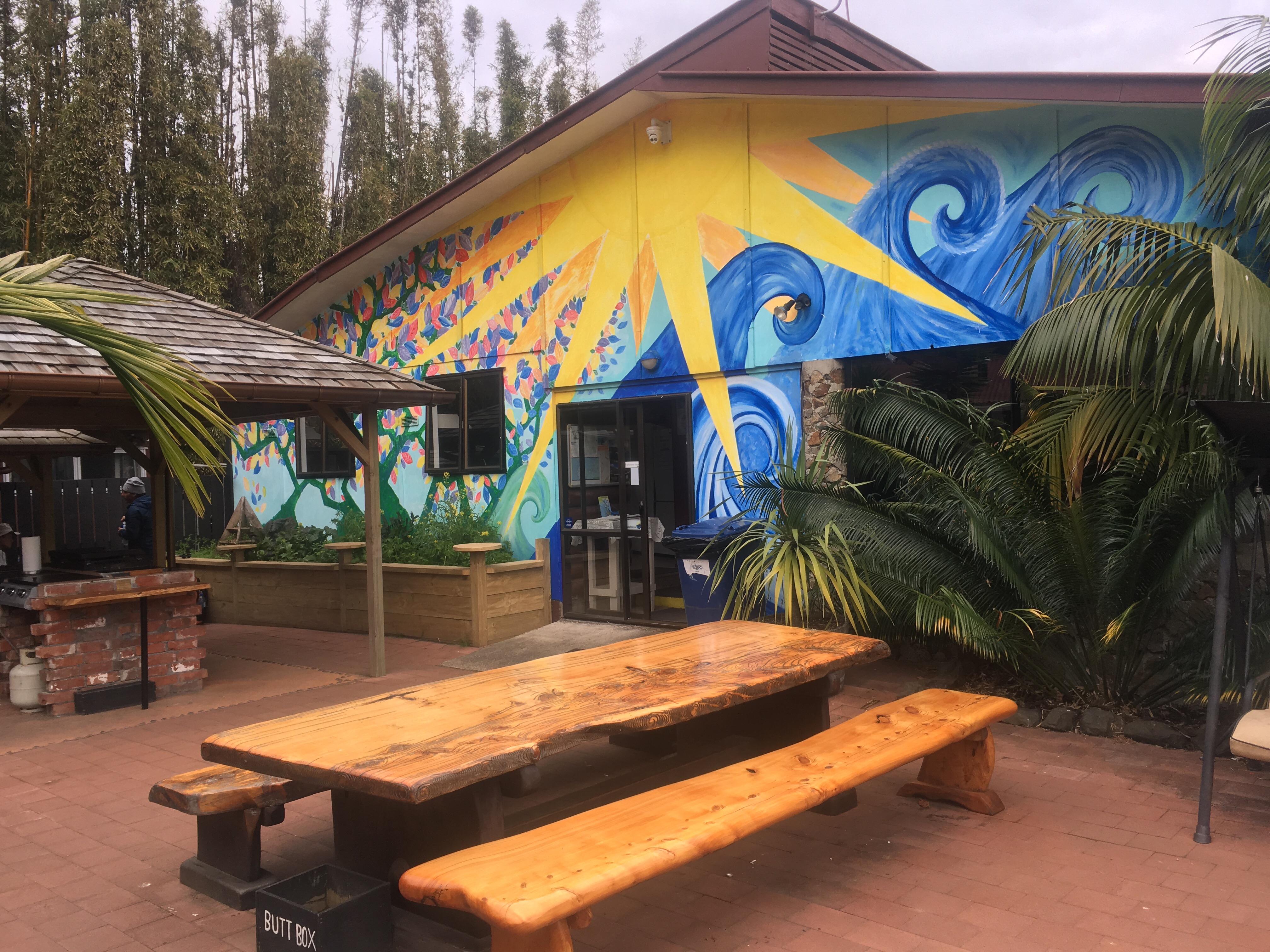 In Ahipara we secure tent spots at a beautiful holiday park- the whole place is a work of art. (Annie, you would love working here!) There were murals painted on many walls, beautiful flowering gardens, tables and benches cut from huge varnished slabs of pine, a barbecue made from bricks salvaged after the earthquake in Christchurch.