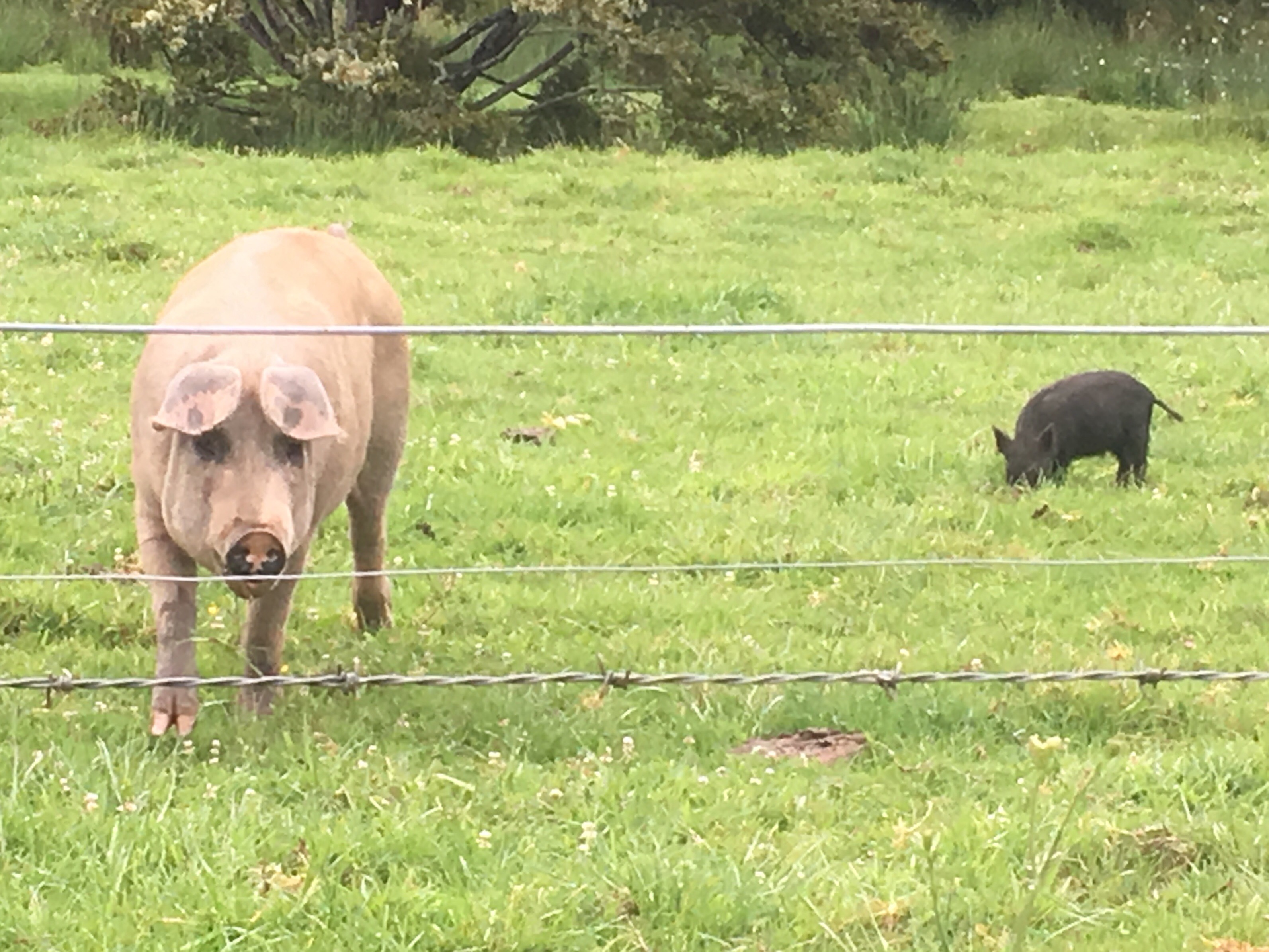 We climb through beautiful dripping forest, then follow Russell Road through farmland. The best part is the baby pigs that can fit through the fences and dart around in the ditches next to us. They are adorable!
