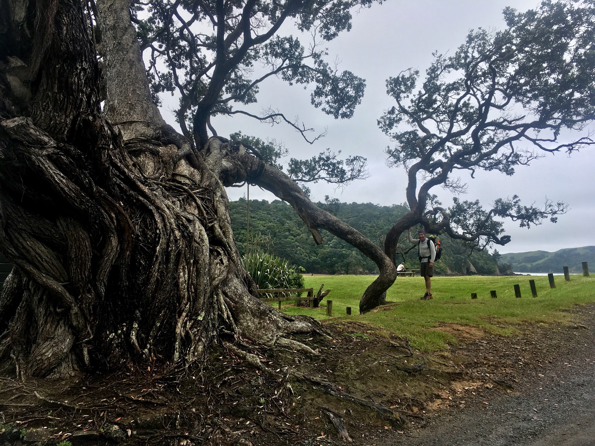 Ellie arrives, then Parker. Where’s Mikkel? “He was in front of me,” Parker is sure. While under the bridge, the rain starts pelting, and we eat our lunch, hoping our fifth duck-compadre is dry somewhere. After an hour or so suddenly the deluge slows, stops, and then the sun comes out. What a difference an hour can make. We emerge, hoping it will hold- and the sky is actively clearing. Yes! Another half k brings us to the beach, with this stunning great-granddaddy of a tree extending one arm down in welcome.