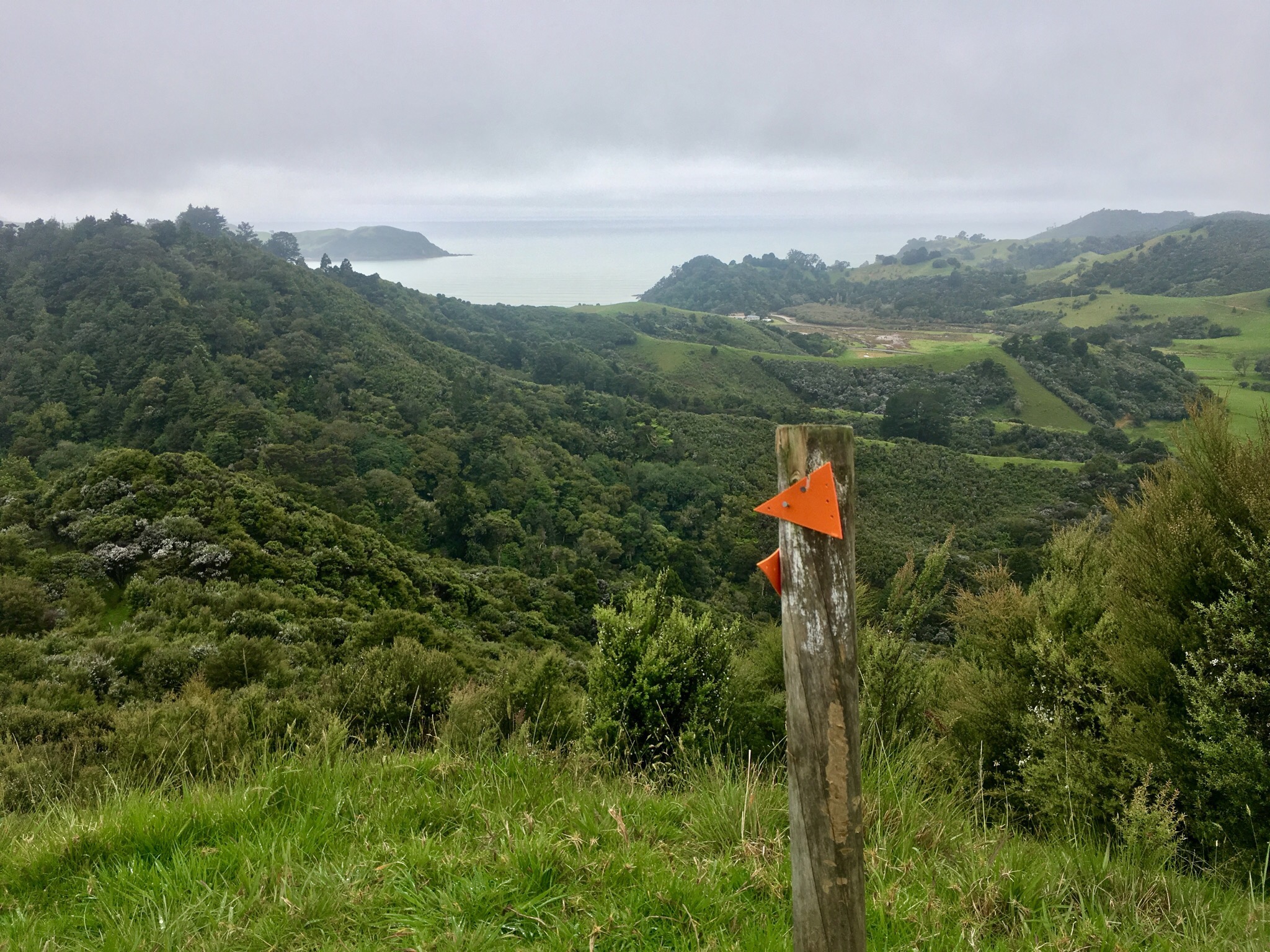 The release from this comes when we cross a stile onto farm tracks and pastureland, eerily obscured by a dense opaque fog. Cows coalesce from and then flee back into the mists, and invisible sheep bleat their plaintive woes. The fence line paths slowly merge and evolve into a gravel road, then a paved road the way a trickle of melting snow gradually picks up enough other trickles to create a streambed, and finally, finally. Finally. We see the entry sign for the Moreport Track, our camping spot for the day.