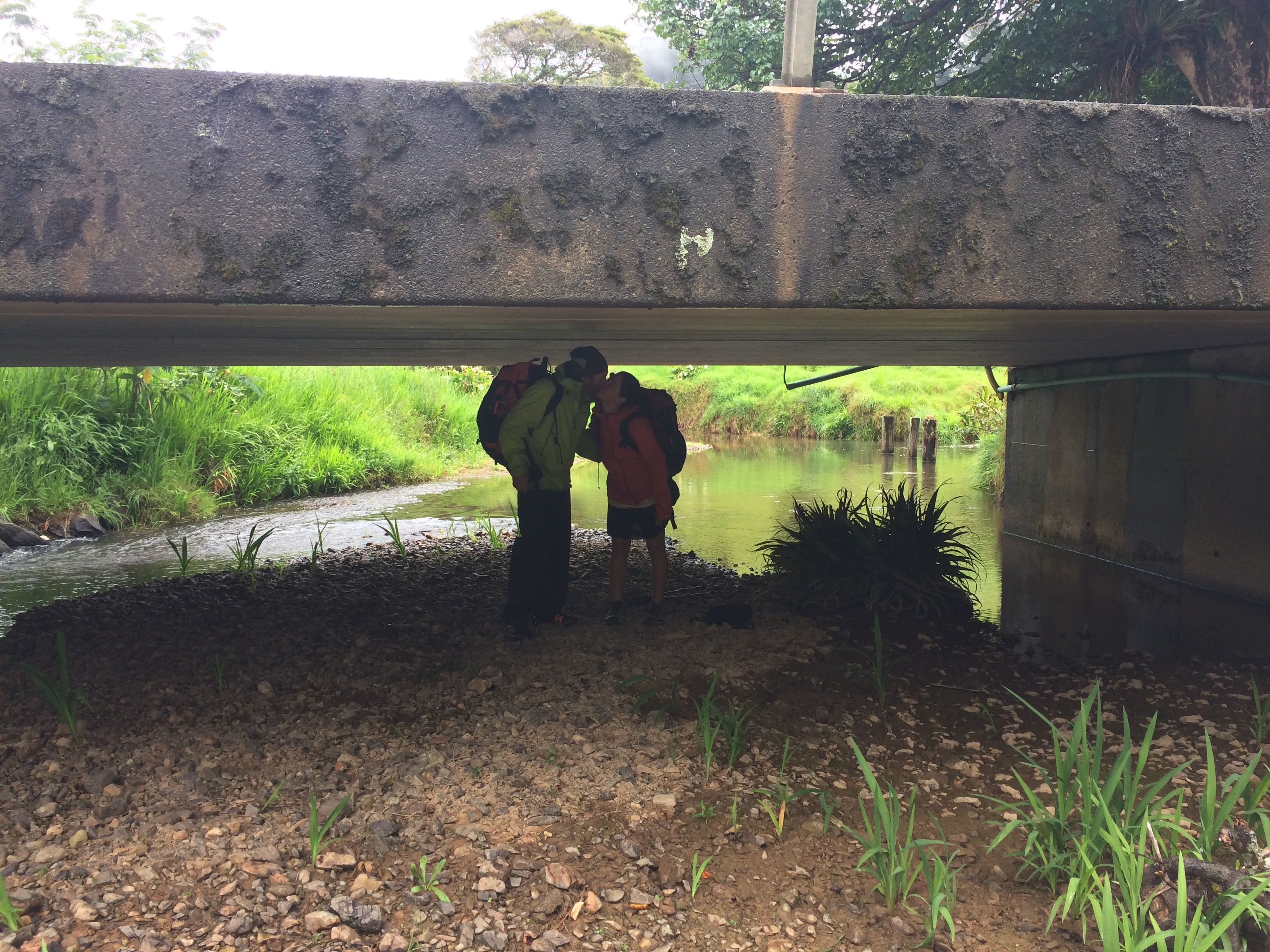 After 17 k, we are approaching the check in meeting point for everyone, and the rain picks up. Ugh, there will be no way to open the packs for lunch without drenching the insides. I have caught up with Prana, and we trudge, feet smooshed, the belly forges empty with the fire dying, when behold, salvation! So many things about this trail remind us of The Florida National Scenic Trail Experience, and here is another: a road bridge with a large dry area beneath it.