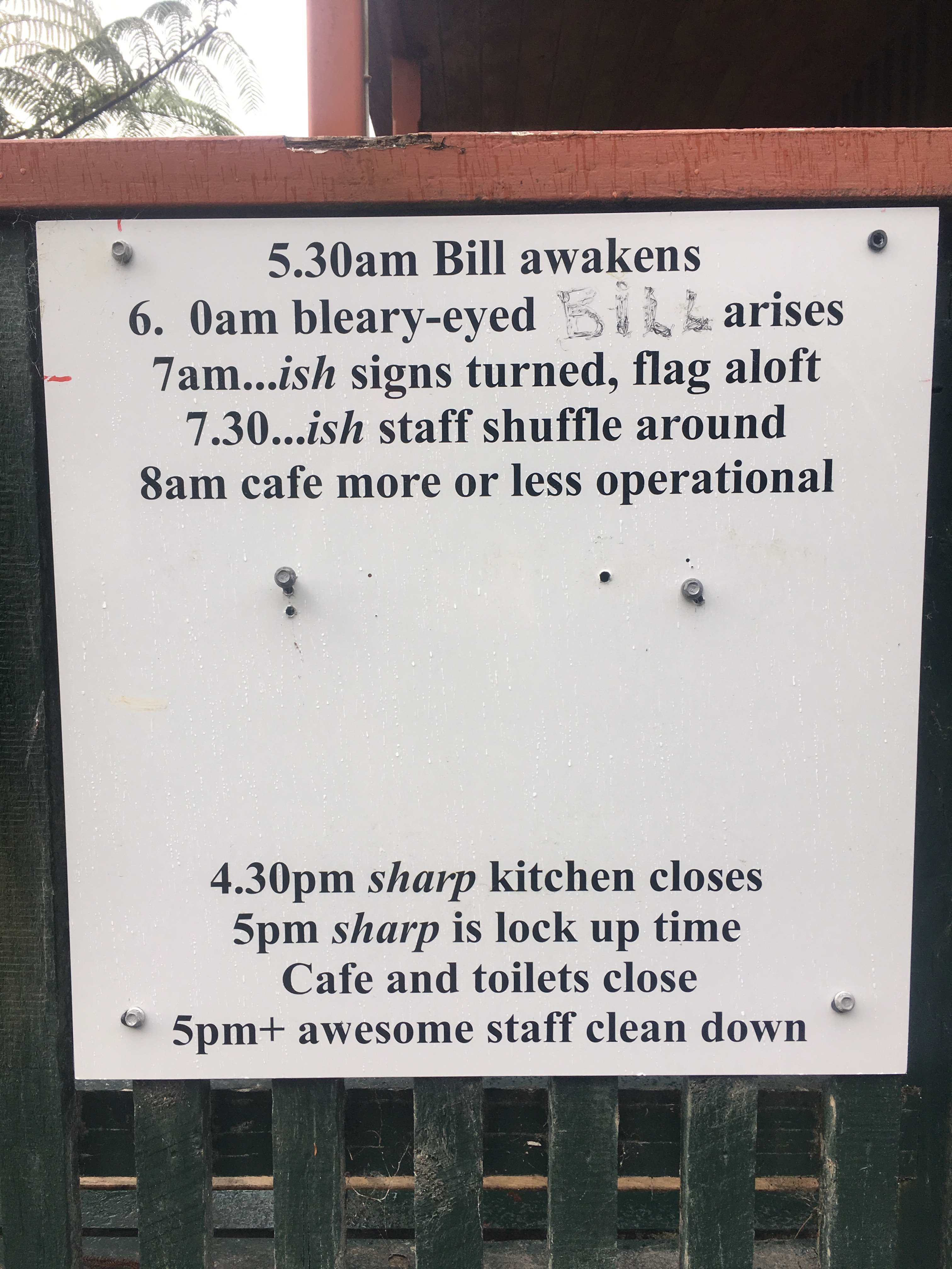 It’s a beautiful simple building with the three walls basically made of glass, views over the corrugated forested, mist-draped land surrounding us. The waitress invites us in- leave the muddy shoes outside, please- and to plug in our phones etc. In addition to the barefoot policy, I also appreciate this cafe’s firm boundaries: