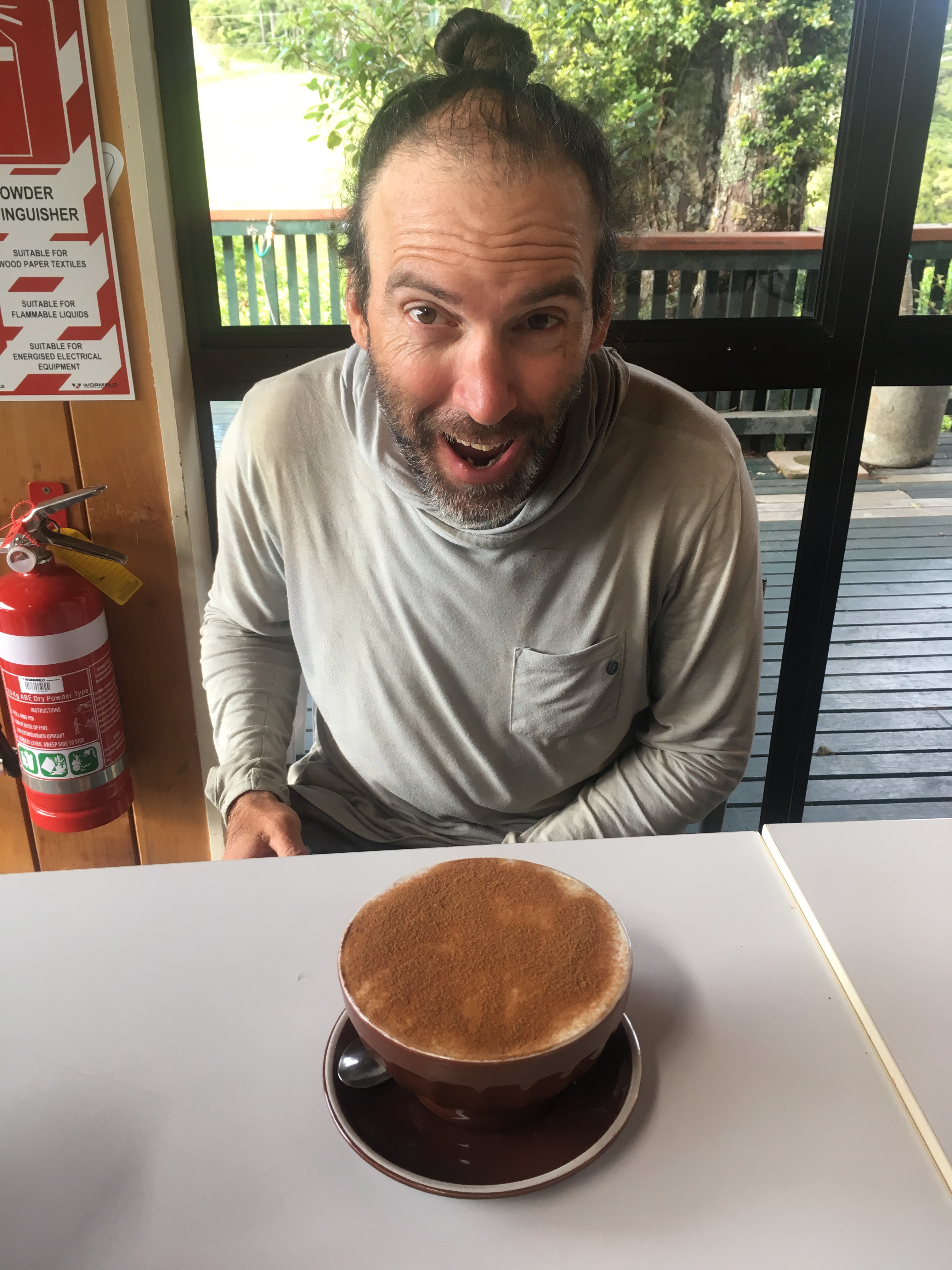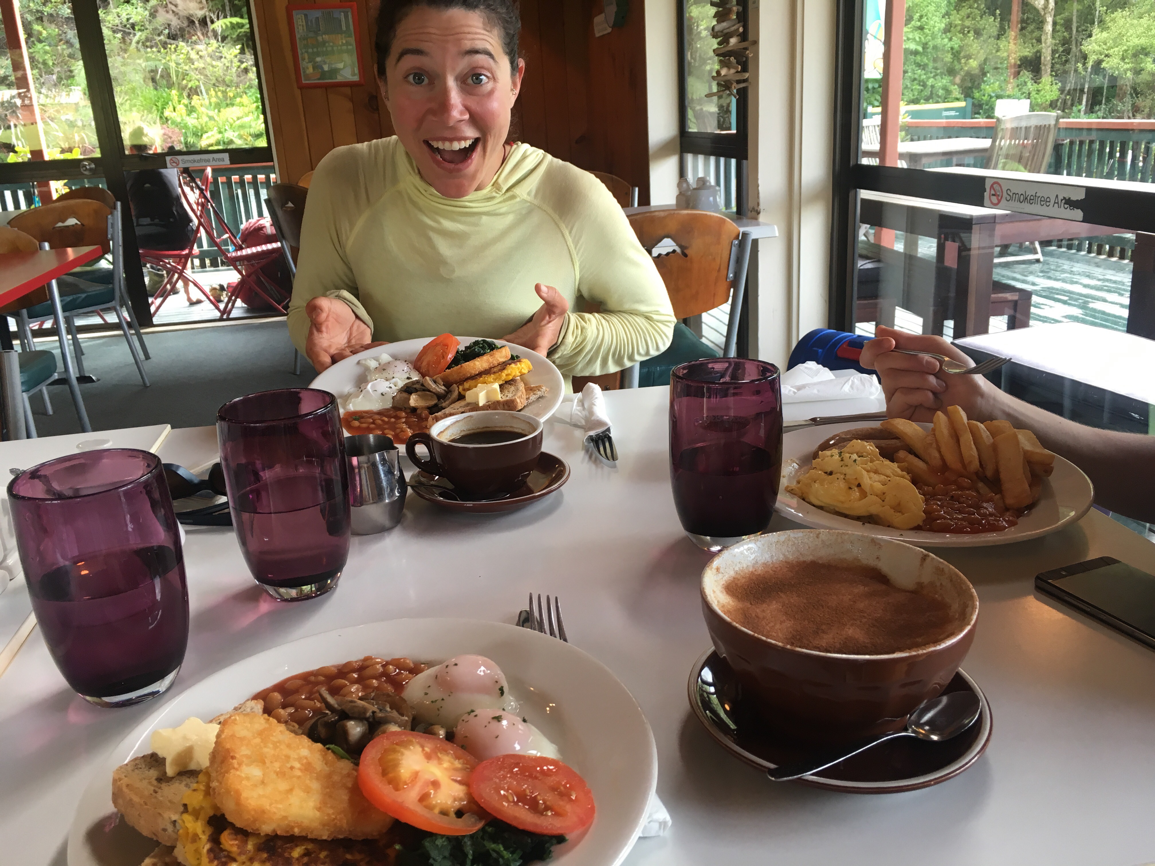Then, this weggie lover’s dream come true, the breakfast of all my desires. I had heard NZ doesn’t do breakfast like the US, which I had believed more than the milkshake rumor; so after the shake experiment flopped I had also prepared myself to ignore my favorite trail meal. But this morning, the rumor is proven wrong. Here’s what came on my plate: sweet corn fitters, hash browns, fresh tomato slices, a pile of steamed spinach, a stack of seared mushrooms, a healthy plop of pinto beans, eggs poached soft, and rye toast. Served with black coffee and spirulina/kiwi juice.