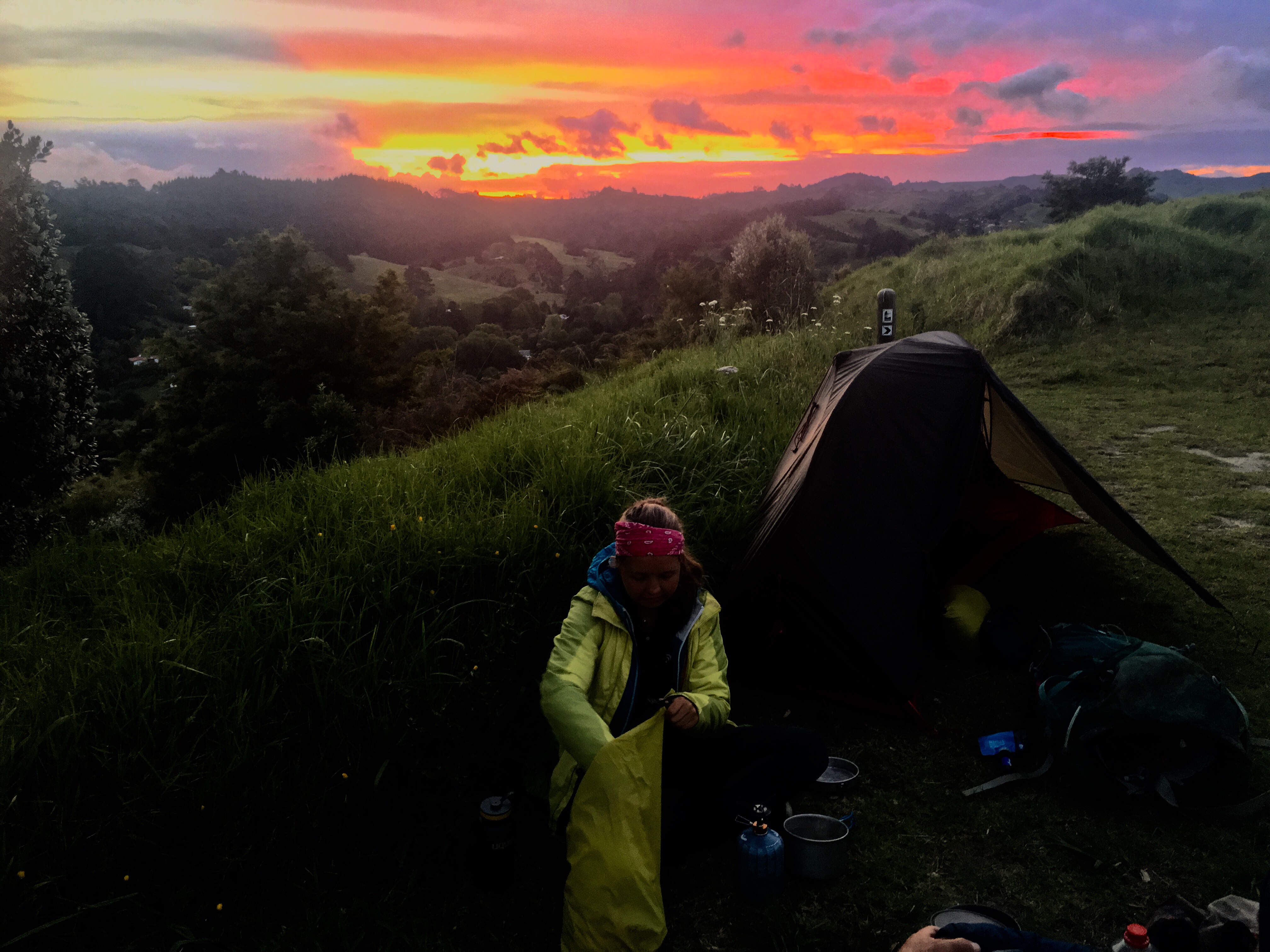 At one point, we wait up for Parker. Turns out he is having a pretty low day, as his blisters have gotten bad from his hiking shoes, and he has just realized he lost one of his hiking sandals. We walk and talk. The day grows late. The whole group convenes at the watering hole, with 5 k to go until camp. I’m depleted from the afternoon, and I keep hoping each turn will be the day’s finish line. We cross an unnervingly bouncy swinging bridge and enter a beautiful deep dark forest- surely glow worm country- but there are no tent sized spots. At last we come out on a ridge where the track is mowed wide enough for our tents to get staked out, and clear enough to watch a technicolor sunset, looking out over the tiny enclave of Puhoi.