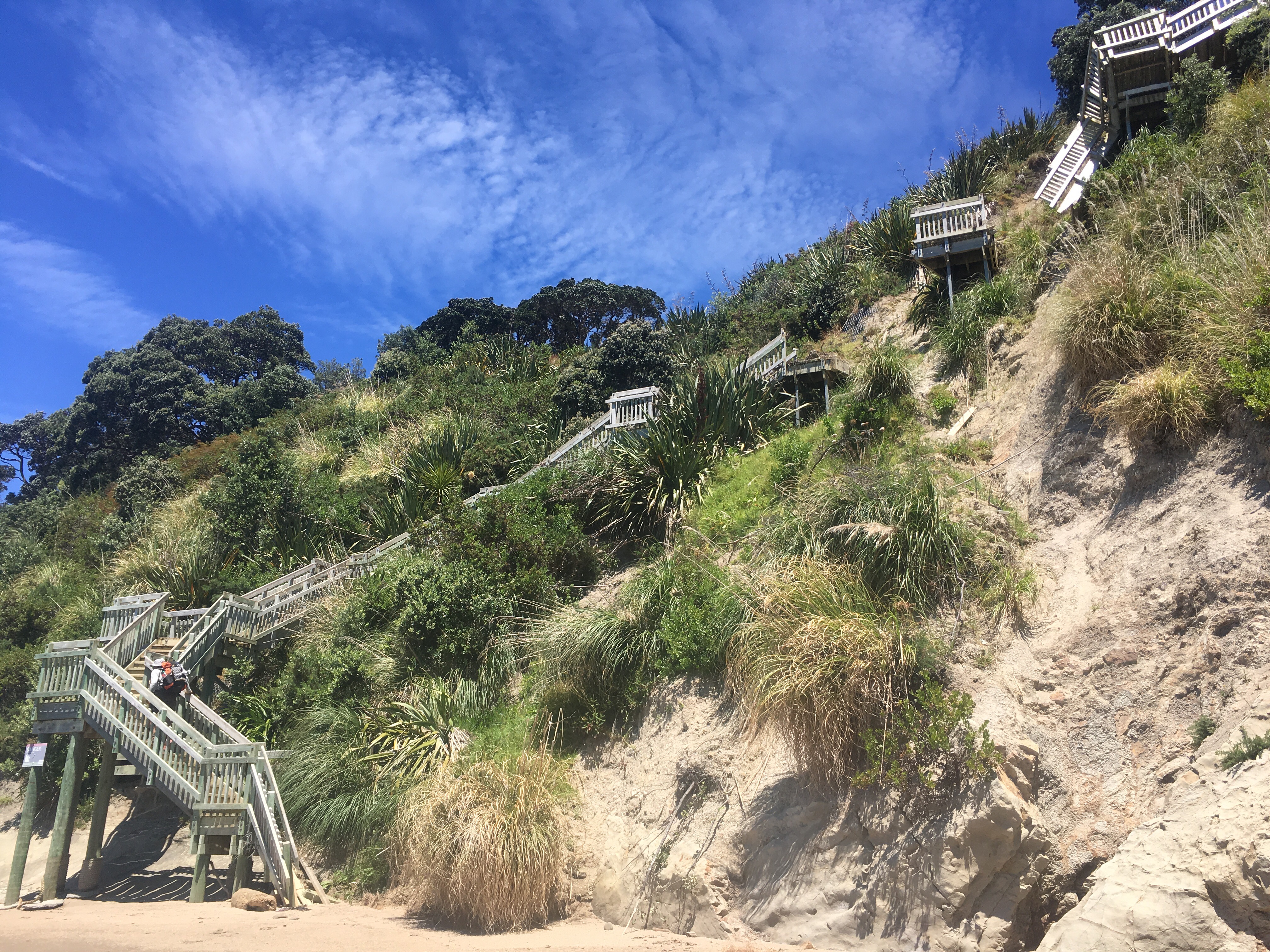 We follow a well defined pathway, then walk the length of the beach, then on a well defined pathway, etc. We pass a historical Victorian homestead overlooking a cove, and walk under huge draping arms of the Pohutukawa tree, the New Zealand Christmas Tree, which are often held up by props and crutches, as the arms are sometimes as big as or bigger than the trunk.