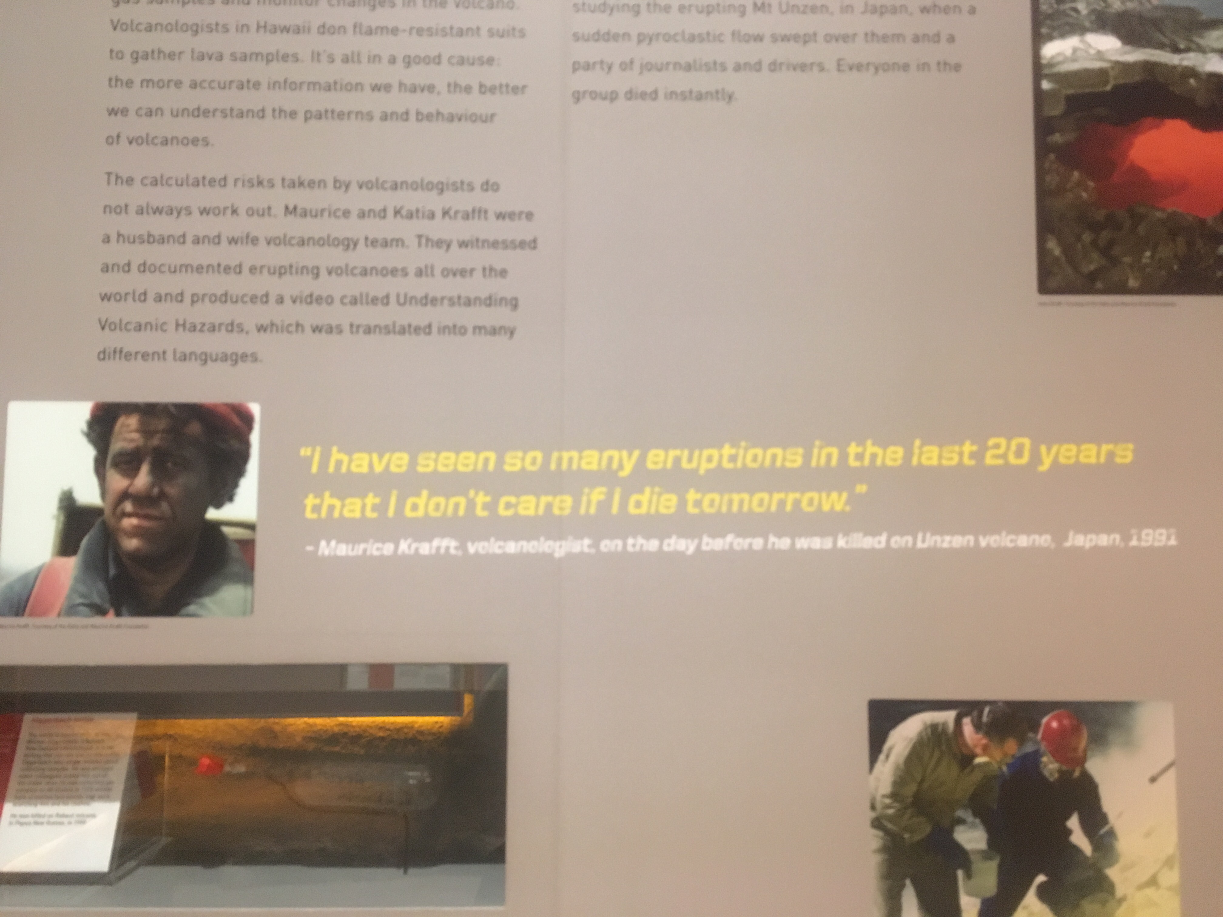 The rest of the volcano room is fascinating as well. The story board are anecdotes from different eruptions, and they all follow a funny little formula: “Tragedy! Doom! Despair! Horror! Death! Buuuut here is this one tiny silver lining.” In one, one of the two survivors out of 28,000 was a prisoner in solitary confinement. The grisly details of the other 27998 deaths recounted, the last paragraph tells how he was granted pardon and toured with the circus after. In one, a huge region was affected, causing millions and millions and millions of dollars of damage, “but on the positive side, the ash acted as fertiliser for the pastures.” In one, ten men died, but the cat lived and was re-named Peter the Great. I remember something similar to this from the Lassen/Hat Creek area on the PCT. Maybe volcanoes just create great stories. Maybe I’ll research them all for a collection someday.