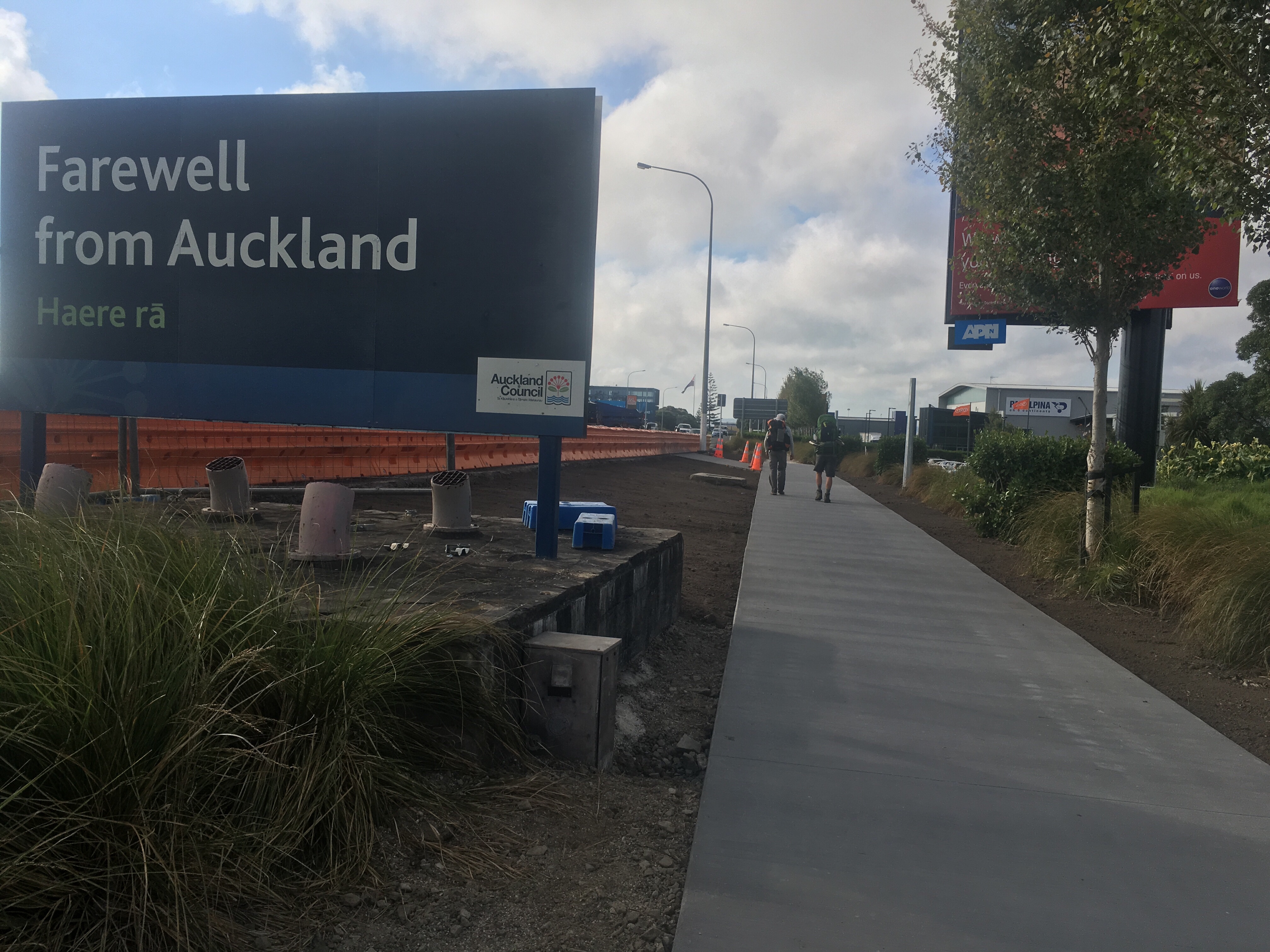 Our next turn takes us onto a busier road, and the next onto busier again. Soon we are near the airport area of Auckland, and the world is filled with industry and velocity. We all dart across the multi lane highway to fill water at a Carl’s Jr (except Bro, who intelligently walks the long way around the roundabout). Considering the risk it took to make it, we splurge on coffee as well. (Coffee from Carl’s Jr.? you may be thinking. I don’t believe I’ve mentioned this yet- every fast food restaurant serves barista-quality coffee, fresh pulled espresso. No scorched-tasting drip machine, no watered down concentrate. Fabulous.)