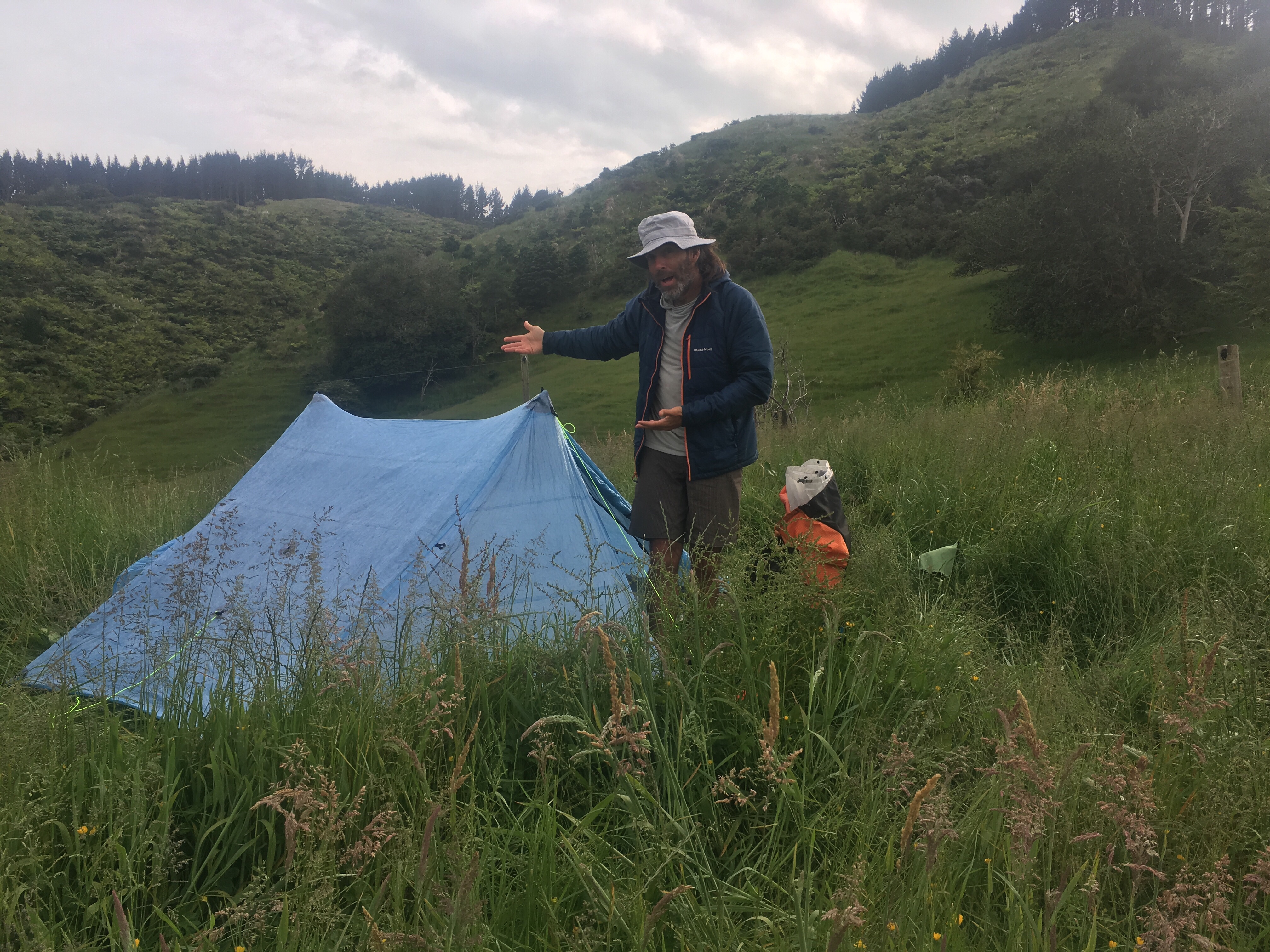 The traffic does die down around 6:00, and we finish walking the road more peacefully. We plan to camp at the start of the next hiking track, but when we arrive, there is not much in the way of flat land. We top the first ridge and deem it flat enough. The grass is waist high, but shouldn’t be too difficult to pitch in, as long as we can keep track of the tent stakes. It is the inaugural set up of our new tent! I am very excited.