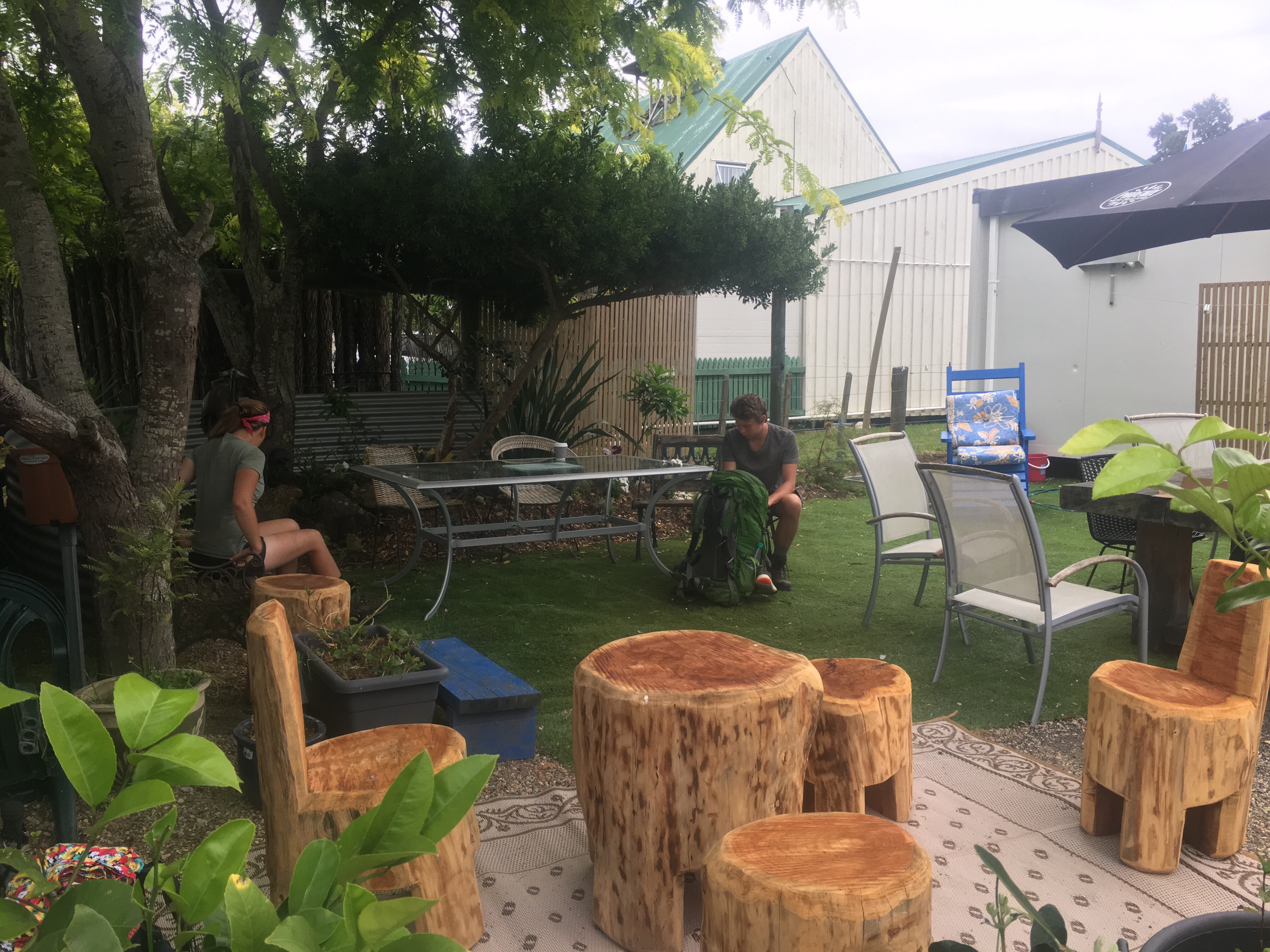 I could sit here the rest of the day. But I pull myself away, walk through a stand of young Kauri saplings -the mentees- and eventually arrive back on the trail. I walk quickly, trying to make a game of catching the others, and suddenly I have a strong, clear premonition that we will see the couple from France, Tristan and Jennifer tonight. I pass Parker and Ellie before reaching a treeless grassy swath where Prana and Bro are setting up tents, along with, true story, Tristan and Jennifer. Tristan and Prana are engaged with Tetris-ing our two bigger tents into the widest grassy area. We all agree this is a great place- while the generosity and hospitality of the businesses the past two nights have been appreciated, between the energy and rustling of a dozen and a half people and the erratic unnatural noises of the highways, the sleep hasn’t been the best.