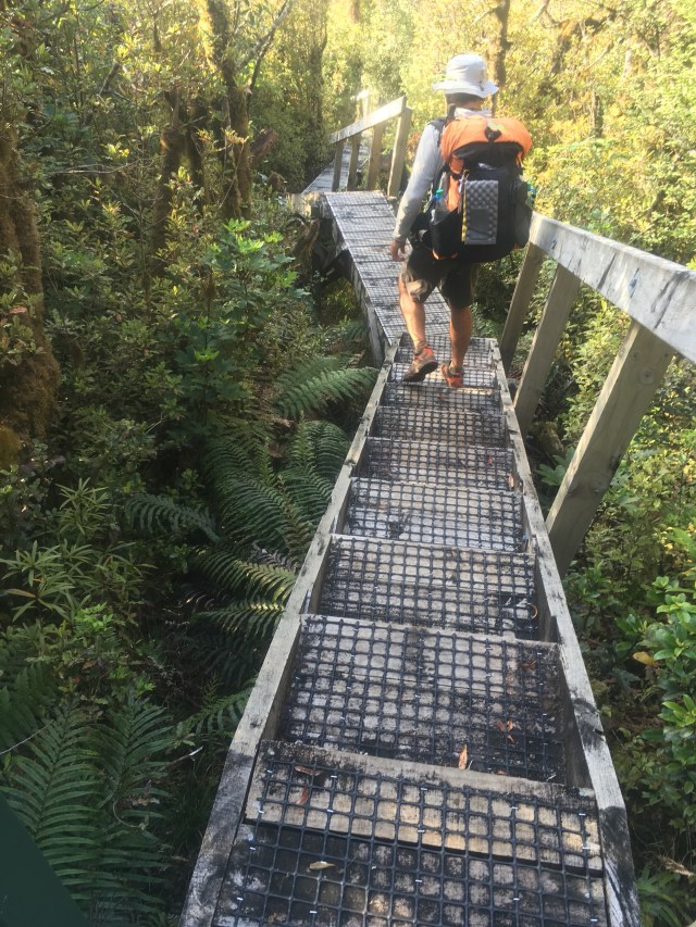 The first bit is boardwalks and stairs to a neighbor peak, Hihikiwi, and we are already sweating. The boardwalks up here are such a complementary ornament to the scene, they feel like floating docks in an ocean of plants.