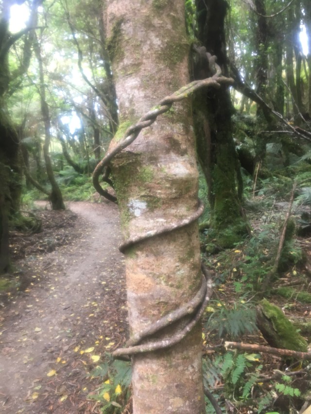 This forest is beautiful. There are so many massive old trees, and the air is saturated with birdsong. I walk slowly, savoring the music, savoring the light play, savoring the colors. Some of the white pines are almost 200 feet tall; some of the other trees whose names I do not know have artfully curled branches, braided and layered upon themselves. I hear a bike behind me, and knowing how many are coming, I find a flat dry spot to just sit and be until they all pass by. A tiny fantail bird hops on a tree next to me, and another tiny bird roots for food in the leaf litter. There’s a cantata of Tui notes echoing out of the canopy. A bright green fern leaf is artfully, perfectly, arched over a darker moss backdrop. It might be the single most beautiful color combination I have seen. But then, there are tiny pinpoints like this every single day, dozens of moments, hundreds of moments, if only we look for them.