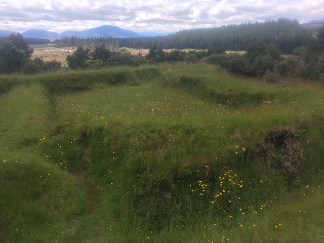 Prana and I reach the road without ever seeing a hint of the Pumice Caves, which are marked on our map as the trail going right through them. Strange. We join a road for a bit with excellent overlooks of the volcanic plateau before veering off into a gorse tunnel. After thrashing through the sticky and stickery pathway for awhile, it empties into a large quiet pleasant grassy area, where the earthwork foundations of an old Redoubt remain.