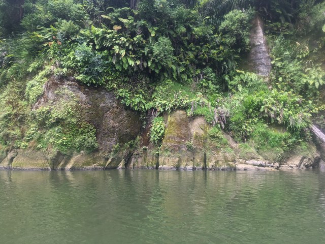 My biggest regret is not taking more pictures today. I am wary of unpacking the camera- it’s been a long time since I’ve been on a canoe, and ours is pretty weighted down; it seems like it would not take much to tip it over. I also don’t take many on my phone, certain I will drop it- the case it’s in is waterproof, but it sinks like a stone. I need to get a floaty attachment for it. The river is beautiful! It far surpasses my expectations. The banks are steep rock- limestone? volcanic? -and plunge straight into the dark green water. I assume the water must be murky, nothing is visible below the boat; but the paddle is clearly visible with each stroke and I realize the river is just very very deep. The rock walls are covered in a rainbow of mosses and algaes; maroon, gold, rust orange, dark and bright and yellow greens. Where the rock is bald, it is swirled and fluted and pleated. Above the cliffs the forest is chock full of tree ferns and moss-draped sky gardens. Springs drip and trickle, and tiny silver threads flow from cliffs above.