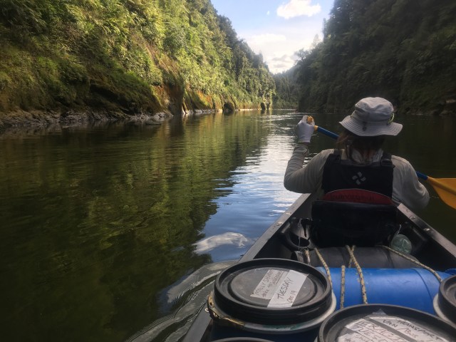 Every van hauling a boat trailer that drives down the road sends us leaping to action. We are used to being up at 5:30, and if we are not hiking before 7:00 it’s because of our own alternative project. After a series of short days we are so ready to get on the river! The fourth vehicle is finally ours. We chase it down to the boat ramp and help unpack boats and barrels. We start packing food and camping gear into the hopefully waterproof kegs, and the delivery guy hands us extremely chocolate muffins as promised by Karen. Yes! We all made the fatal mistake of packing today’s breakfast in with the food being delivered this morning, somehow assuming they would arrive earlier, so the muffins taste even better seasoned by a forced fasting. They aren’t quite the brownies my aunt usually sends (the main drawback to an out-of-country trail?) but they are the first things we have had in a week that have been actually made with love. We learn that Mike No Evil put on a day ahead of us, and which I’m selfishly disappointed about, but it’s no surprise. I think he walked from the end of the Tongiriro Crossing to the river in one day. His message says he will wait for us at the halfway boat ramp.
