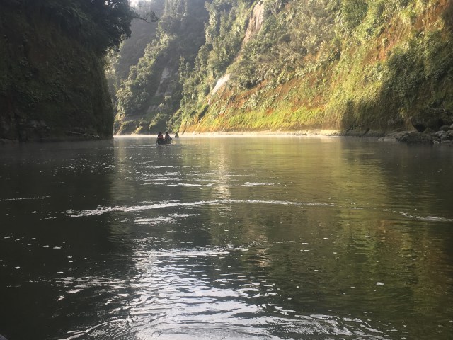 Eventually the morning lightens into full blown day. We strip off rain jackets and puffies, and after a few hours start running through several riffles. We are keeping a sharp eye for the Ngaporo campsite in order to take a snack break, and prepare ourselves for the notorious rapids below it when we hear the white din of frothing water from downstream.