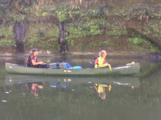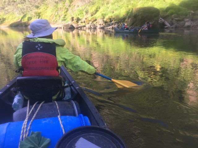 Next up on the river is supposed to be a visual illusion called ‘The Drop Scene,’ where the river looks like it disappears into the earth, but that never really materializes. And then there is another big wave rapid! This may or may not be the rapid the Canoe Hire called 50/50. Prana and I line it up and go right for the meat, of course. The main wave breaks over the bow, three-quarters filling the boat. Again, it’s instantly cantankerous to control and prone to rolling over, but we manage to paddle over to the side and start bailing. Ellie and Bro are next, and run a great line, right before their canoe dumps them unceremoniously into the river. They float past, nudge-swimming the dead weight towards the shore. Jo has a clean run in her kayak, then Mario and Peach have a clean run. The rapid is 25/75 for our group! Prana and I get enough water out to paddle over to Ellie and Bro, and with the combined force of 3 half gallon milk jugs as bailers, eventually scoop out most of the water. It was a gentle capsize, and nothing was lost or ruined by soaking, so everyone is in fine spirits over the adventure. We sit down at the bank we are at to have lunch and hope a whole passel of boats will pass through to bet on. Our lunch spot is shadeless, and our roasting vigil is rewarded with a single canoe run- no flip.