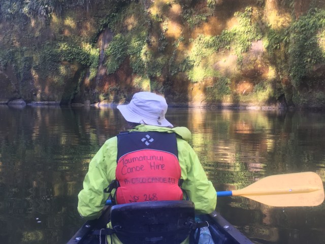 Hmm, strange. I didn’t think there was anything noteworthy until after Ngaporo. Meh, maybe there’s a rock causing an echoing hole in the water. Rounding the corner, we see a very tall white wave. Woo! We run right down the middle and Prana gets a lapful of water. And we learn how easily a canoe wants to tip over once it has many gallons of water in it. We carefully paddle to shore, and tada! it’s the spot we were wanting to stop anyway.