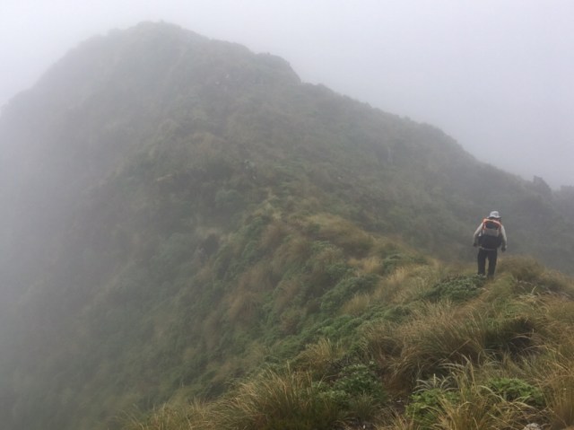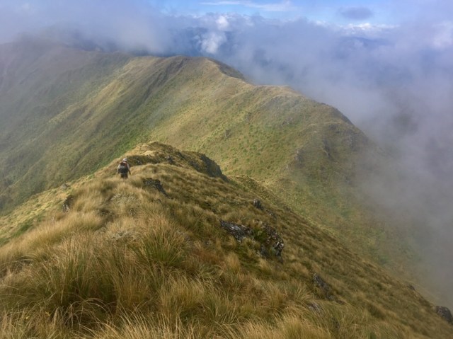 It takes surprisingly little time to make it to the summit, and the sky clears on the descent of the far side. The trail is spectacular, a vision balanced on the steep spine of the ridge. I can see how it would be anywhere from unsettling to terrifying with 60 mile an hour winds.