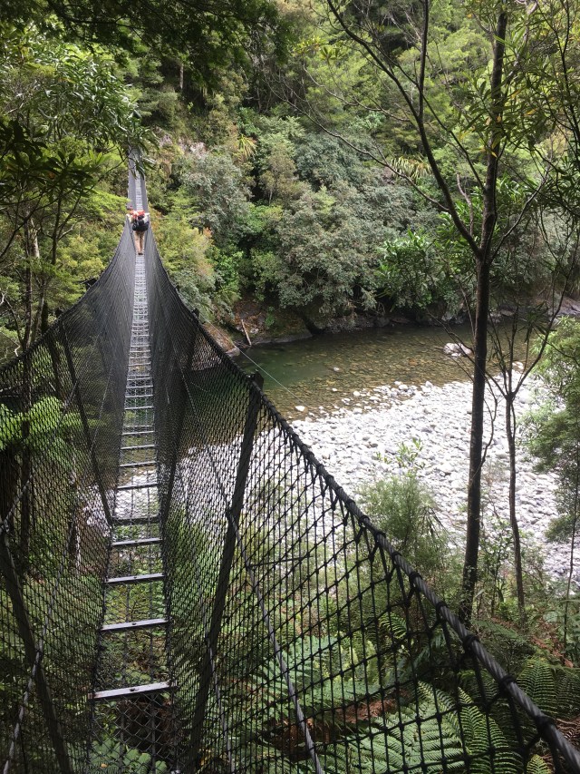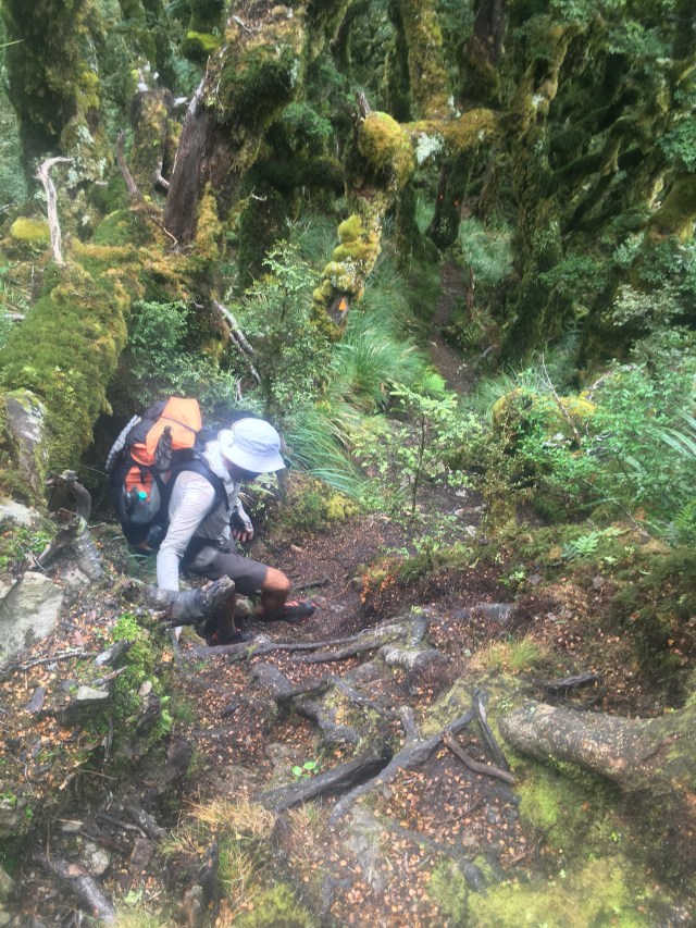 We descend and descend, half hiking, half sliding. Most of the time we stay in control, but I’m surprised there are no injuries. Down, down, down. Just when I am trying to guess whether my knees will give out first or if my ankles will, I hear the river below. Around the next corner Prana and Bro are taking a break, waiting for me. We all agree to still make it to the hut for lunch. The downward hurtle finally lessens, then disappears. Flat land! Well, New Zealand flat.