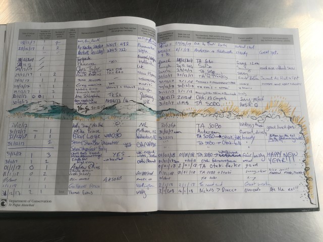 We set a leave time of 2:00pm, devour lunch, then try to work on planning for the South Island. It’s a headache trying to juggle all the notes on our phone screens, and impossible to predict how fast we will want to go in each section or when we will want to take days off. 2:00 ticks towards us, and frustrated and now out of our momentum, we decide to stay at the hut and keep working on plans. This decision instantly feels right, and we change out of our putrid hiking clothes. We find a Van Go in the sign in book that perfectly describes the last descent.