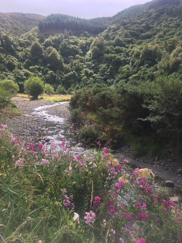 The bike trails have good tread, and strangely, an installed metal sign next to a picnic table recognizing the halfway point of the Te Araroa! Whoa, we’re halfway there! Well, we’ll celebrate again. Everyone is feeling the ponderous packs and long mileage of the day, and drops heavily onto the benches. A short break is all we can spare, and then we resume our southward march. The mountain bike trails eventually dump us onto a forest road, and the wind picks up. Oh my feet hurt. If I didn’t know better by now I would think they were crippled for life. I listen to music and try to pretend that my feet are nerveless and my pack is light, you know, try to test the mind over matter thing. It doesn’t really work. At least the world is pretty.