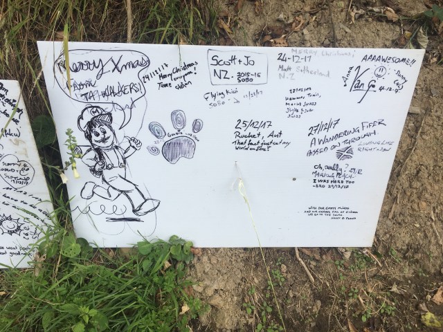 The track out of town is pleasant, winding along the Turitea Stream, and then climbing some simple gravel roads. At one turn there are three big white sign boards proclaiming the halfway point of the Te Araroa. Whoa, we’re halfway there! There are some signed names we recognize, and someone has drawn a giant, smiling dick with a speech balloon on one of the open spaces. How discouraging, that this seemingly represents this year’s hikers. We sign our names and decide it’s as good a place as any to have lunch. “You know, someone should draw a picture over that,” muses Mario. He grabs a marker and gets to work on it. The end result is pretty good; you can’t even tell what it originally was.