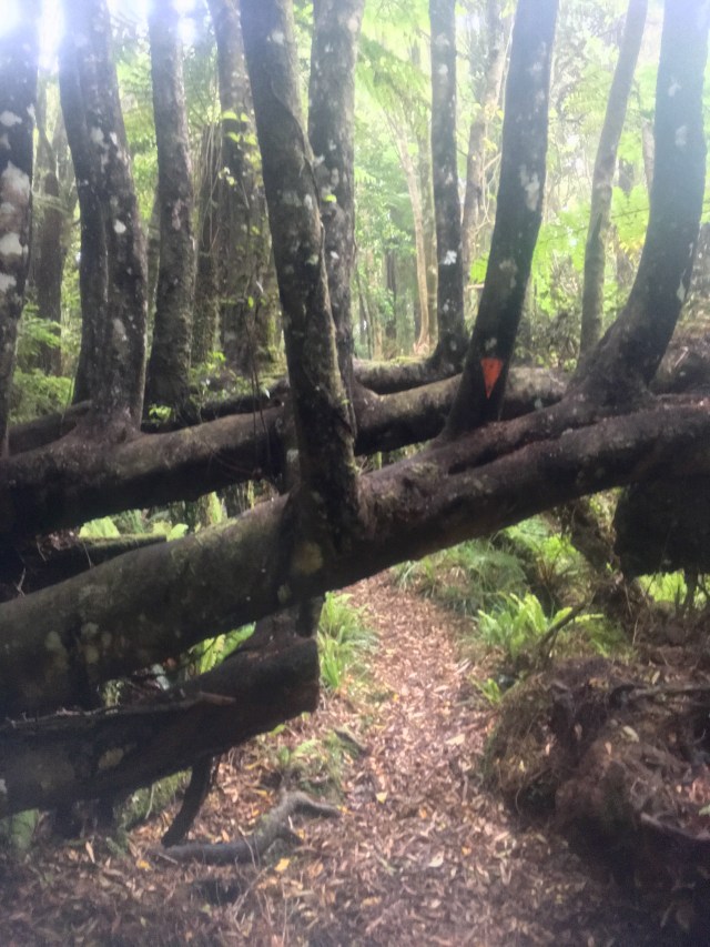 It is steep, as expected. And beautiful, more so than expected. It doesn’t take long for Prana to open a lead, but then I hear murmurs in the forest, and the inimitable voice of Shroomer booming joyfully from somewhere above. How is that?! When I catch up, I trade big hugs with Shroomer, who is radiant about his trip through the mountains. “Coyote and Sergio are not too far behind me,” he reports, and describes the cold and tempestuous conditions they had traveled through. “We had Christmas in Wellington and it was just easy to start at the south end and head north,” he explains for how they came to be traveling this day and this direction. Mario and Peach catch up as well, and Shroomer meets Mario’s proffered hand with a bear hug. “We were just talking about all you guys and figured we would run into you!” We make sure that he is planning to stop at the Mikahaka Outdoor Center, then reluctantly excuse ourselves to hike on. If only we had been a day earlier or they had been a day later we would have have ended up camped at the same hut! If only!