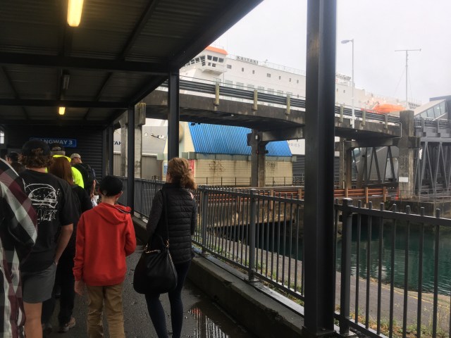 We make our way to the main deck and to the building in which to reclaim our luggage. Bag after bag rolls by, and then I start to recognize bags going by for their second round, third round…where are ours? As the anxiety starts rising again, they appear, whole, unmarred, and with all gear still attached. 50 minutes to make it across town to the water taxi with one final stop at the Information Center. There’s a long line, a creeping line, a line that doesn’t have an exit, but instead requires the finished customer to push back through the entire waiting mass to get out and make room for the next customer. When we make it to the front, we pick up the camping tags for the Queen Charlotte Track, which is our first 84 k, from a disinterested clerk and push our way back out to our water taxi and freedom.