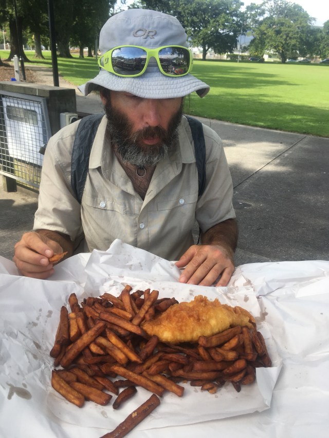 40 sweltering minutes across boiling asphalt later, we finally reach the inn, which is Bug as in VWs, not insects. I take this as a promising sign; it is cute, an old couple of houses converted into rooms, and there is a fish and chips shop around the corner. We put our packs in our room and go for the fish and chips, which turns out o be the kind of place where you order the type of fish you want (Prana goes for the fish burger, I order snapper), and has kumara (sweet potato) fries which carmelize in the fried. A massive win.