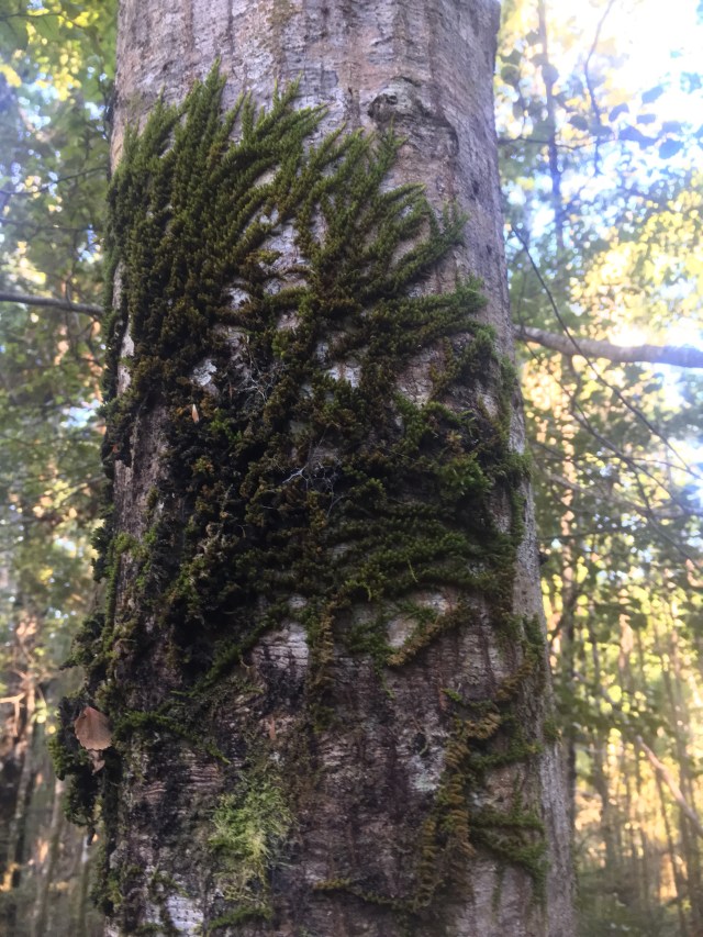We drop from the open views into stunning, clean, mossy beech forest, tracing a ridge that will bring us back up to Slaty Peak and around the backside.