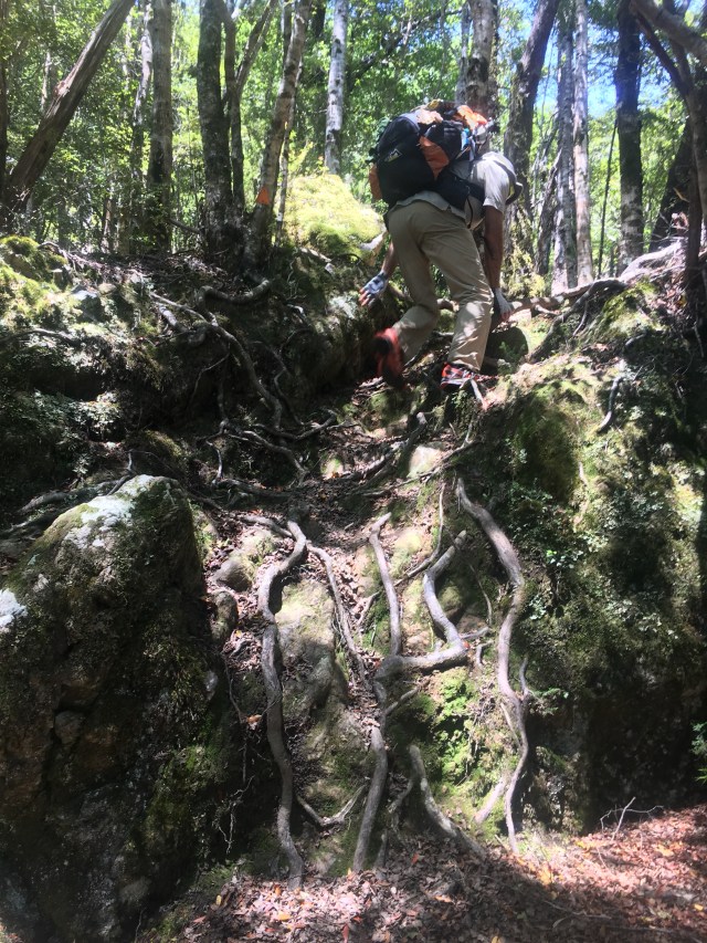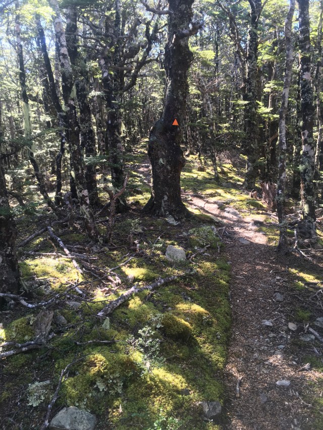 We wake up in our perfect secret campspot and eat breakfast and pack, still sandfly-less. It’s easy to see how a person could get completely turned around in vegetation like this, you have to be practically standing on the trail to see it, but we chose and memorized a few unique trees and are standing on the trail in short order.