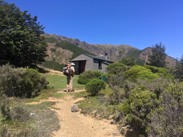 As I drop into the valley that holds Hackett Creek, the track morphs into a huge mown swath through the grasses. Mown? How would you even get a mower up here? Maybe it was a perfectly trained regiment of goats. Or llamas. The Hackett Hut is also nondescript, other than the black, lab-ish dog that comes snarling out in a frenzy. “Oh, the dog’s nice!” calls a woman’s voice from inside the hut. “I don’t know if he knows that!!” calls back Prana. Thankfully she comes out and distracts the dog with a toy, and we learn that her husband is out hunting for the day. Before we can learn much more, the sheer density of bumblebees and ground hornets drives us away from the hut and onwards.