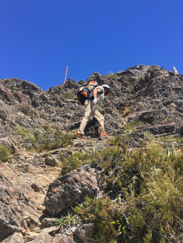 There is a woman walking down towards us carrying a radio and a can of orange paint, a Dept of Conservation worker brightening up the poles that mark the route we will follow. We chat with her briefly about the weather before carrying on to the top.