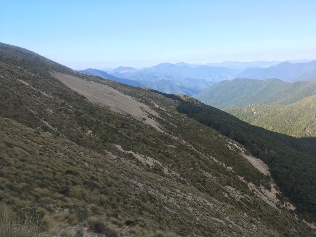 Mt Starveall is a rounded, gentle summit, and the views are incredible. We can see back to the Golden Bay coast and the Abel Tasman Track, and I try to imagine which spot this was on the Richmond silhouette we could espy from the Abel T.