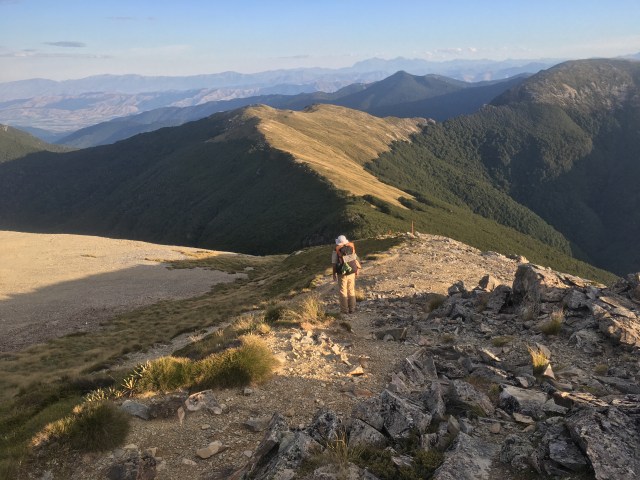 We cross more musical shale and descend onto a forested ridge a bit past 8:00. We pass by a suitable camp at the beginning, holding out for one at the far end, hoping to gain another half a kilometer tonight in the gamble. We drop much more elevation than I realized I was anteing, and before the trees and their protection, thin out completely, we find flat spot big enough for the tent. A spot which is pure rock beneath the moss, meaning the stakes won’t go in.