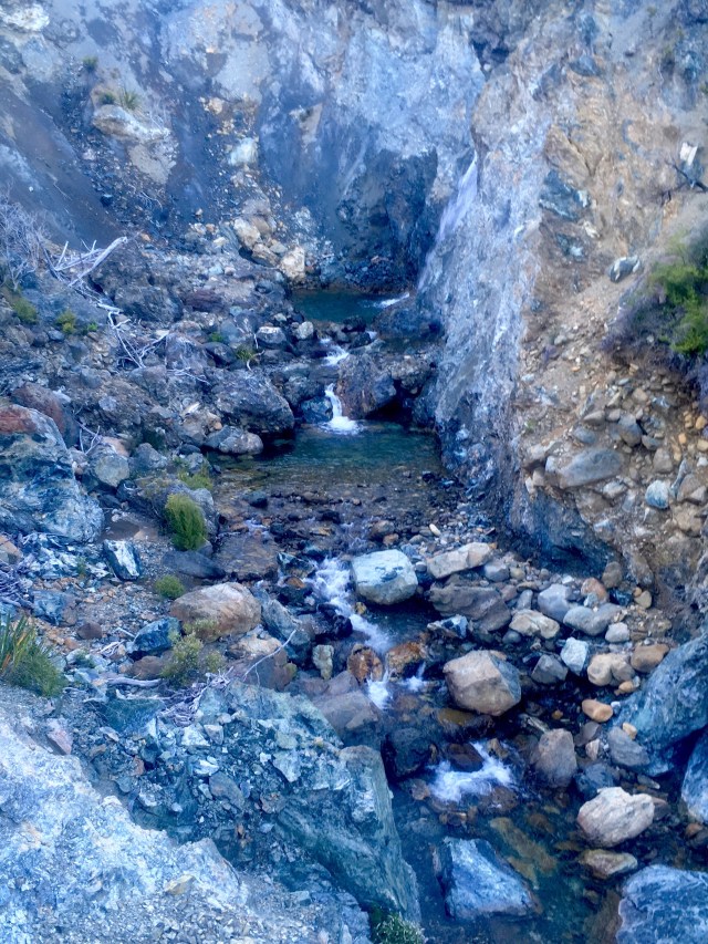 The trail leads up at a generally gentler incline, but there is still plenty of up. The wasps seem to finally be lessening, and the climb is interspersed with long glorious pseudo-flat switchbacks, with rootless tread. Switchbacks! How I’ve missed these. We zoom down through open underbrush and gold and silver mosses, banking on the turns. I forgot what it feels like to use my whole stride! Wheee!