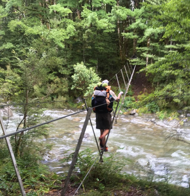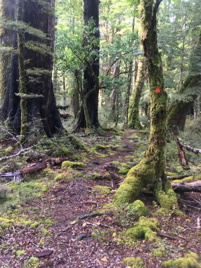 We leave the hut, and have easy walking and small creek crossings. Occasionally the track darts into the trees and squeezes along the crumbling bank, then returns to the open ease of the meadow as the river swings away again. As we proceed downriver, this dart and squeeze move happens more and more frequently. One intriguing detail is this: the orange arrow markers are few and far between, and don’t even come close to matching the gps track on our maps, which is often on the opposite side of the river. Which is correct? I suppose it doesn’t matter, as long as we keep finding the next orange arrow.