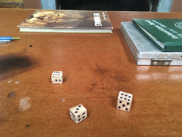 The main room has a fireplace and homemade dice on the table in front of it. I am impressed by this as much as the roof timbers.