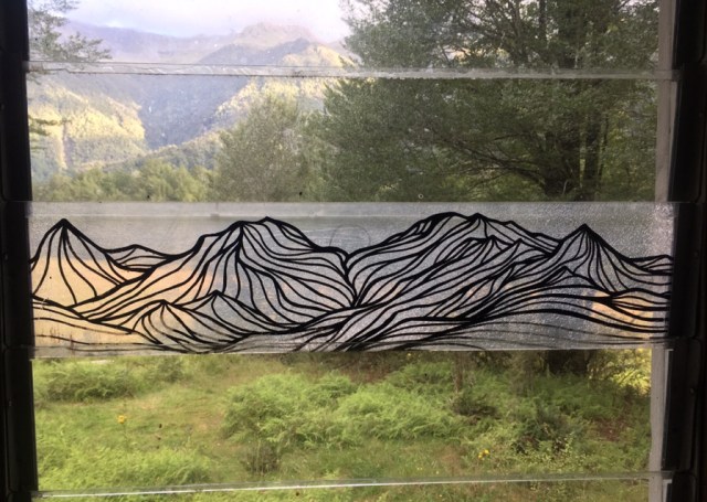 Eventually most of the river meadow is on our side of the river, and we reach Kiwi Hut- it has kind of an abandoned air that is not terribly inviting, although it does have a few endearing details. Inside is a beautiful etched glass panel depicting a mountain range, and on the hand-carved name plate there is an adorably lumpish kiwi with proportionately Moa-sized legs carved into sign.