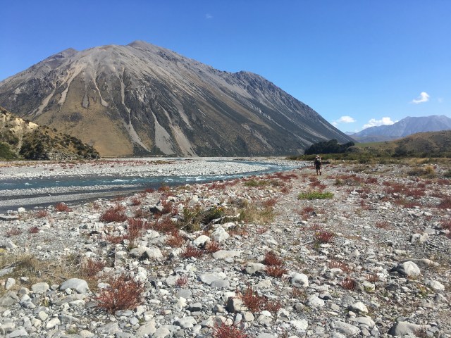 A short distance and a bit of searching brings us to a faint 4wd road, and we follow this for easy navigation and many shallow crossings of the Harper River. The day has warmed enough that the chilly water feels refreshing, and at 12:30 we stop for lunch in the sun in the long grass meadow on the bank. It’s delightful, and Prana marks the holes in his mattress (9!) while I journal and Mouse naps. A DoC guy drives up in a battered white 4wd truck filled with his family. “I’m taking care of the tree on the bridge,” he explains, “and I thought if I was coming out here, we may as well camp for the weekend.” I renew my reincarnation wish to the universe.