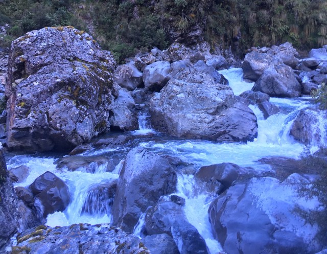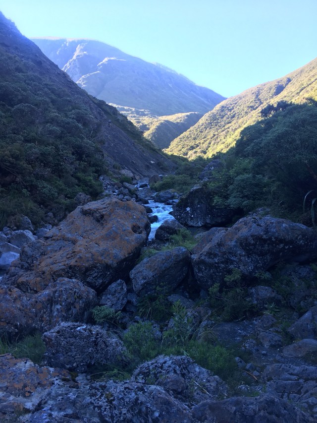 Even more weirdly than my stomach, we still have not seen Bigfoot Mouse. We check the map and can see that it has only been a half a kilometer since we have last seen her- how could she not have caught up yet? We come up with all kinds of scenarios. Maybe she took a nap at the bivvy. Maybe a helicopter drop asked her to help and she is now a committed volunteer for race support. Maybe a helicopter offered her a ride! Maybe she is somehow trapped in the hut. Maybe she fell in the river? After some musing, Prana and I go decide to go back and check- mostly because Prana accidentally locked me in Tarn Hut in the Richmonds, and he wants to be sure that hasn’t happened now.
