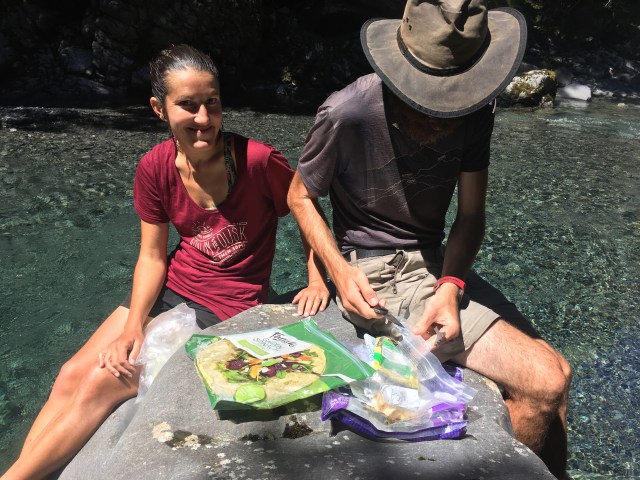 When we finally reach the road, Prana and I have some kind of mystifying misunderstanding about where to hitch from. We seem to alternate getting neurotically stressed out about town, and today it is his turn. Mario and Peach have decided to hike in, and when hitching doesn’t work out, we resign ourselves to the same fate. I continue trying to hitch as we walk, and one kilometer out of town a German couple picks us up and whisks us the rest of the way to the DoC office. We miss retrieving our box by 8 minutes. Looks like a mandatory night in town.