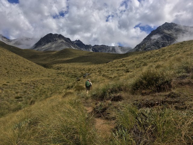 The rain finally clears at noon, the sun popping out and the shift happening dramatically and abruptly. We hustle to make and eat lunch, and then follow the trail up towards the saddle. The air is fresh, the sun is hot, the fast moving clouds cast fast moving shadows that stripe the mountain and fluctuate the temperature as they speed by. The track itself is gorgeous, alternating patches of tussock and swaths of shaly scree.