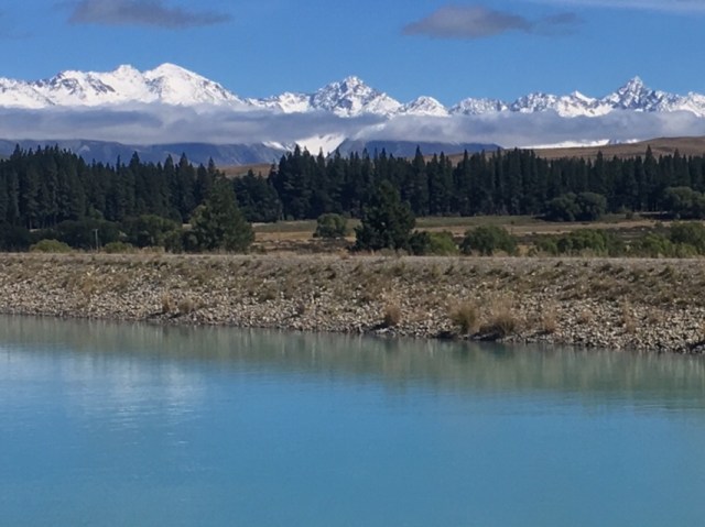 Our whole day will be on the Alps 2 Ocean cycleway, a mostly gravel and occasionally paved flat walkway. We follow it away from the hostel and across the dam on the lower end of Lake Tekapo, and from there it leads generally south with the rocky rushing river on one side, and the placid canal on the other, both of them the same bright opaque turquoise. The trees are bright greens, almost yellows, and the dark and white contrasting far background complete the beautiful scenery.