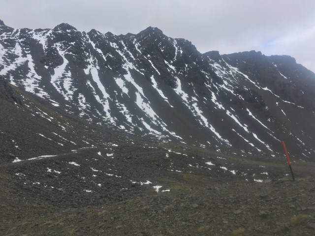 The temperature is at the unfortunate exact point where hiking uphill in rain gear is too hot, and hiking without is just on this side of too chilly. I switch back and forth a few times, then commit to the chill and push myself to hike as fast as I can up the track as it winds into the spectacularly jagged black rocks of the upper pass.