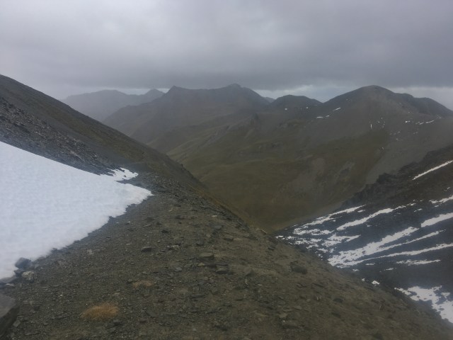 When the wind dies I am up on my feet again, and I leave the switchbacks below the head of the pass for a long descending traverse across a scree field on the mountainside. This is where the fury really comes down. A haymaker of a gust whooshes in, and I go sprawling head first into the rocks. I try to rise and am literally unable to stand up against the power holding me down. Large pebbles and small rocks are now flying through the air, pelting my face especially, so I turn my back and close my eyes, The band The Dead Weather plucks and strums, and ironically pleading if ‘will there be enough wind when my ship comes in,’ languidly into my ears. The gust subsides.