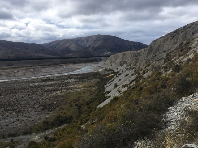 We keep a brisk pace to warm up, and they are all packed up and right behind us. The flat trail steps down by shallow benches until the final steep drop into the silt-sided gorge of the Ahuriri River.