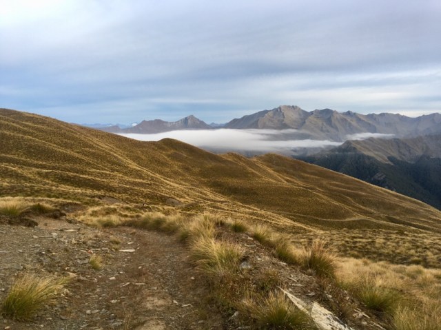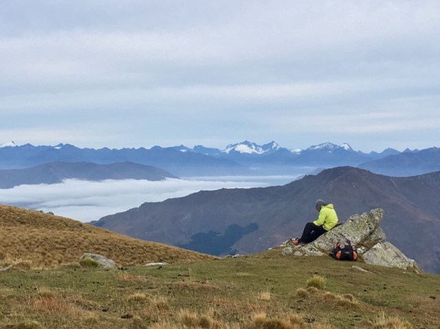 Mouse had left before us this morning, and we reach her at the trig station that overlooks Lake Hawea. Jagged cliffs and rocky plates line the walls that careen straight down to the lake, which is the ghostly shade of glacier blue.
