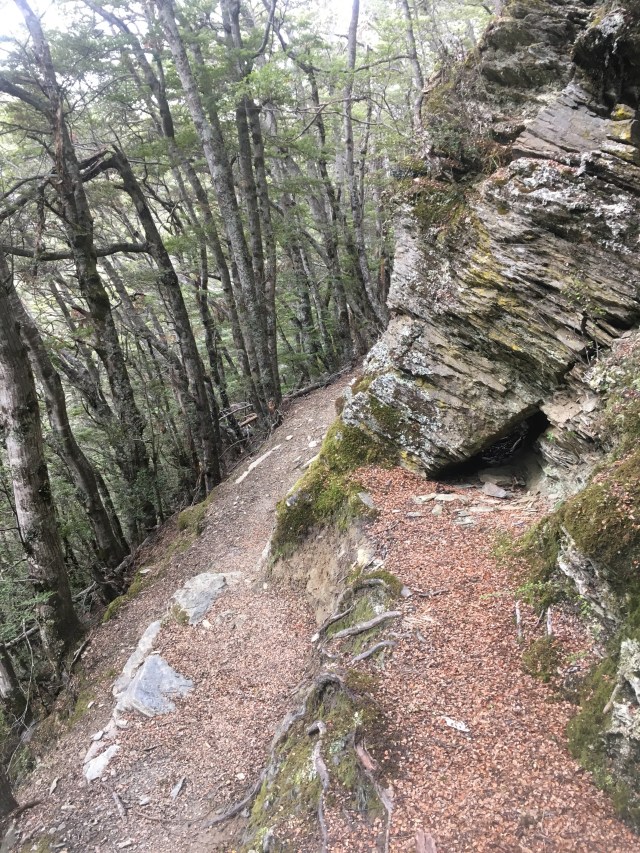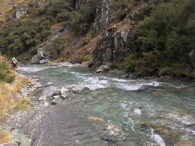 I race and bound and miraculously never trip, and Prana joins in the light-footedness on the way down. We descend all the way to the Arrow River, but aren’t sure if this is the spot where we can choose to walk in the river ‘at low flows’ according to the track notes. After some classic up and down sidling on crumbling narrow track, we decide in the river is probably fine from here, and take the next opportunity to cut down to the water.