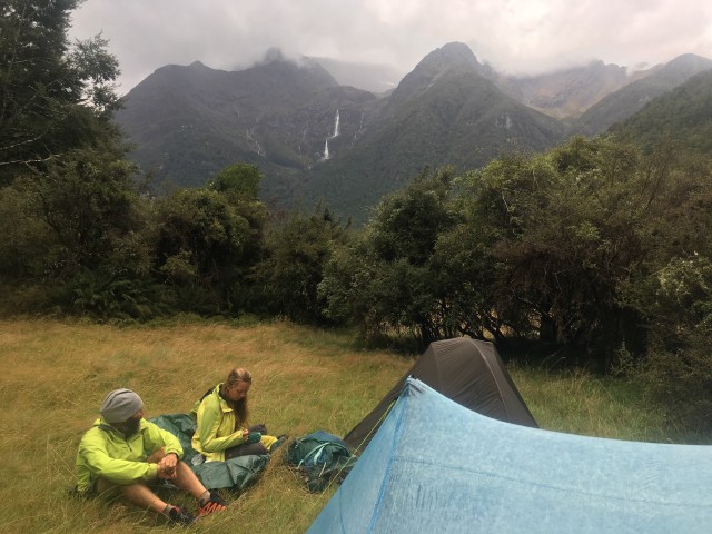 At the trailhead shelter, our gentle driver wishes us luck, and we face our decision- to start the trail and bushwhack off for camp, or try to find something off the road we drove in on. We have opposing opinions, and I prove the validity of mine by searching for and finding a spot that is flat, comfortable, completely out of sight, and a legal distance from the no camping areas of the Routeburn.